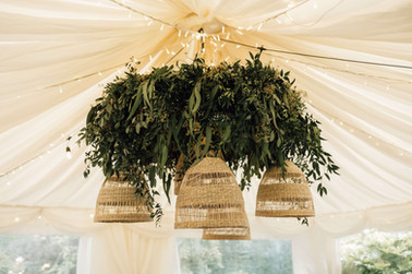 The styling was simple and relaxed, yet elegant. Rustic wooden trestles draped in pale blush muslin runners with an eclectic mix of bottles, collected by the couple, filled with beautiful blooms and vintage brass and glass candlesticks. Two large foliage chandeliers dropped from the marquee roof with a mix of wicker lampshades hanging down from them.